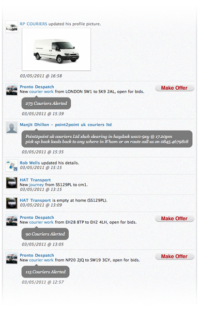 As every booking is placed on mtvan it is reported on the news feed. We show you who has posted the work and the collection and delivery details. If you can cover the work, just click through to make an offer.